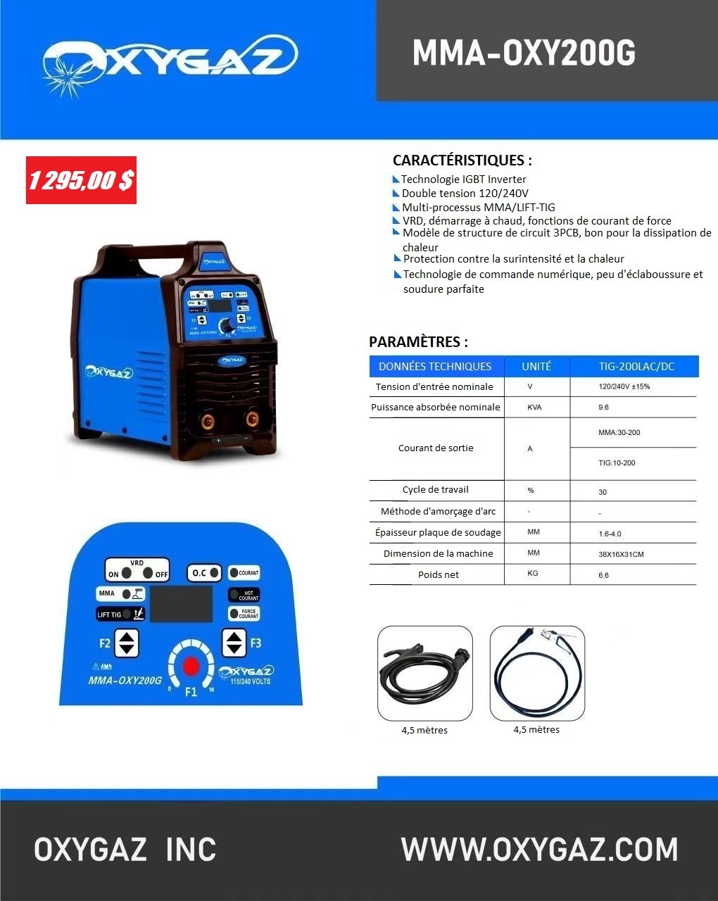 La soudeuse à baguette Oxygaz vous permet de souder des baguettes jusqu'à une grosseur de 3/32 sur le 120V et 5/32 sur le 240V. Elle est portable,facile à amorcer et aussi très sécuritaire grâce à sa technologie VRD. MMA-OXY200G